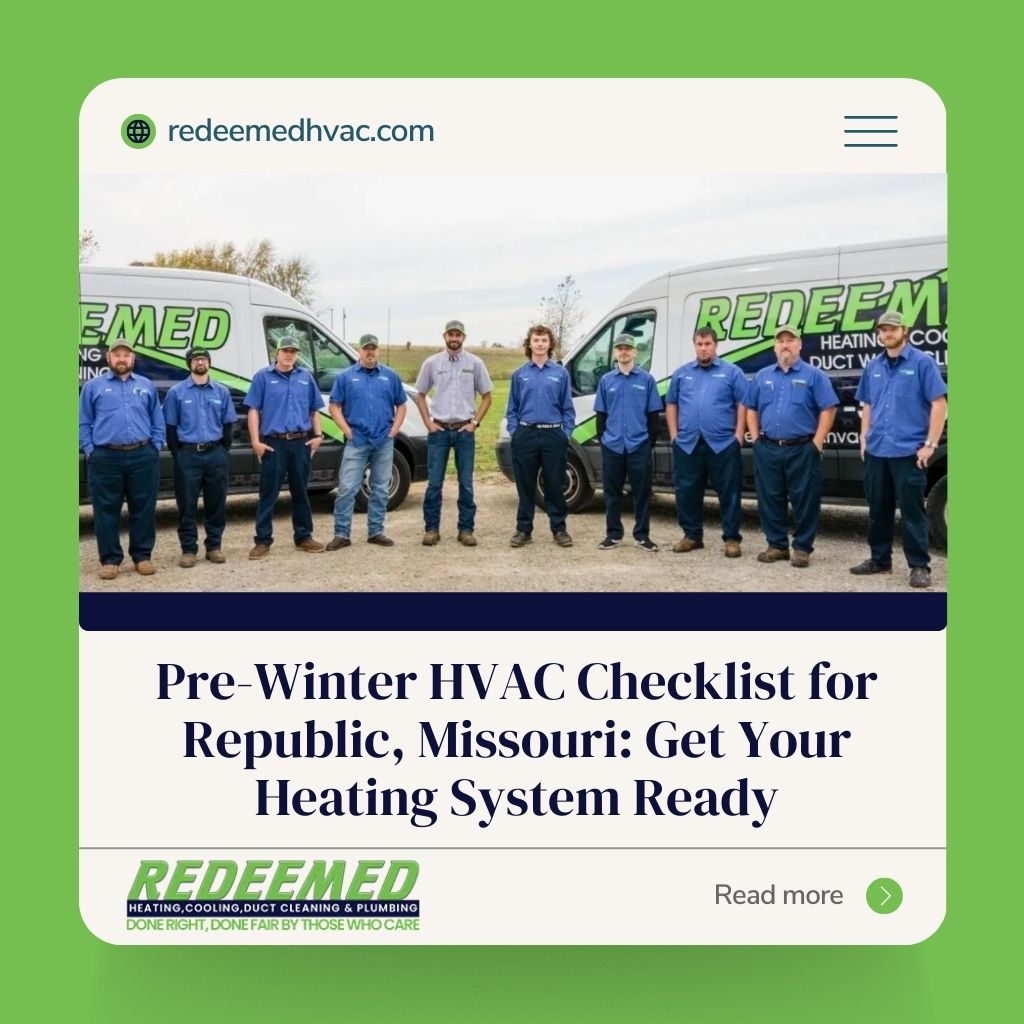 Don’t wait for winter to catch you off guard! Whether you need a quick furnace inspection before winter or a comprehensive heating system maintenance Republic, Redeemed HVAC is here to help.